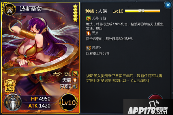 波斯圣女作为单体秒杀卡牌的代表,只需过了第一回合便可以完美带起节奏。“天外飞仙”不光有高额的伤害,被杀死的单位无法重生,复活,轮回这一设定,也就意味着只要成为波斯圣女的刀下鬼,便会万劫不复。值得说明的一点,此技能杀死的敌方单位除去正常的重生,轮回等无法施展,连复活卡牌的复活技能以及法宝的复活都无法使其重新获得新生,真可谓“死得彻底”。“天外飞仙”虽为绝技,但“天启”特性可以完美填充输出间隙,保证每回合都能触发,让你真正体会到波斯圣女带你飞的感觉。再加上65%的闪避往往让敌方望尘莫及,闪闪闪,你懂的。