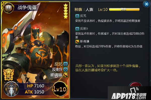 战争傀儡从技能上来看,很明显是作为法系克星的定位出现的。单就“反射”来说,高额的法术反射伤害对于脆皮的法系输出来说已经是噩梦。加上神技“反咒”,不仅可以免疫不良状态,还可将此状态返还给释放者。法系输出,特别是带有控制的,稍有不慎便会被战争傀儡“以彼之道还施彼身”。“断魂镰”伤害不俗,并伴有吸血效果,大大加强了其站场能力,所以战争傀儡可以完美的称作法系天敌。