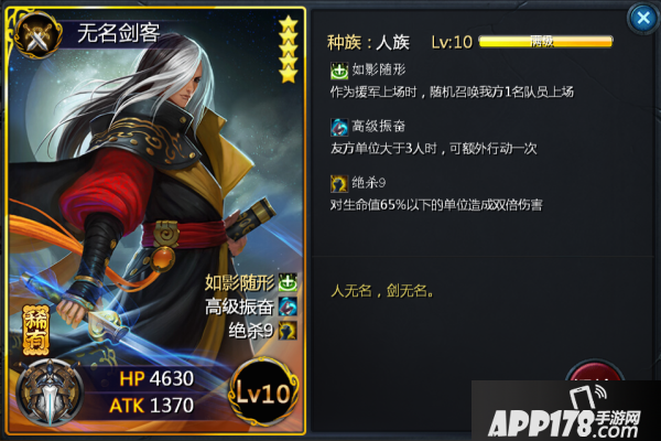 无名剑客作为曾经的传说卡,后续被无情的砍为稀有。虽然卡牌品质降低了,但是个人认为,其作用依旧是传说级别。作为援军上场的无名剑客因为其“如影随形”特性,很容易会将局势扭劣为优,再配以满足多于3人必定触发的“高级振奋”以及可造成双倍伤害的“绝杀”,无名剑客可以保证在其行动的回合强势输出,伤害爆表。单就基础伤害1370来说,触发“绝杀”的无名剑客一击可以造成2700+的伤害,配以“高级振奋”,其一轮输出已高达5400+,收割不再是梦想。