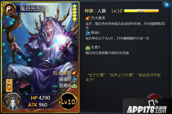 鬼谷先生作为火系法师的代表,自然而然少不了全体aoe技能和焚烧状态。每回合都可以施放的“烈火燎原”可以在敌方受到伤害的同时附以2回合焚烧的dot伤害。小道消息,焚烧的dot伤害可是按照敌方单位的生命值上限来计算的,也就是中了焚烧状态的单位生命值越高,受到的伤害也就越高,从另外一种角度来讲,鬼谷先生也可以算得上是巨人杀人。此外,“振奋”特性更是保证了其在特定条件下的输出质量,而“自愈”也加强了其生存能力(ps:“自愈”也是恢复血量,不受“治疗转伤害”影响哦)。所以,在敌方没有法反单位的前提下,鬼谷的作用不言而喻。