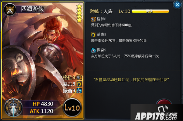 四海游侠是玩家自主选择可以刷出的第一个五星人族卡牌(天外天四重天掉落碎片),作为一直被众多玩家忽略的一张卡牌,四海游侠就输出能力来说还是很不错的。1100左右的基础伤害配以“暴击”的特性,可以打出近2000的伤害,再加以“振奋”额外行动一次,每次可以造成近4000的伤害量,对于脆皮来说足以致命。此外“格挡”的物理伤害减免也加强了四海游侠的生存能力。