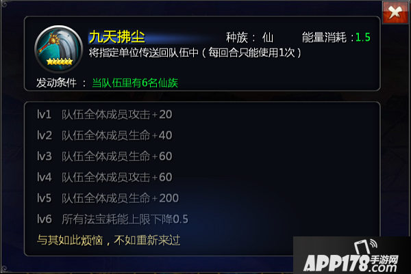 说到恶心,仙族的几个法宝也是小编心中永远的痛。仙族拥有即时型治疗法宝“七宝妙树”,不仅能加血还能概率清除异常状态;拥有即时型控制法宝“冰蚕丝”,可以全体概率冰冻;拥有复活型法宝“杨柳甘露”,可以复活死去的队友立即进场。还有一最最最最最最最最令人深恶痛疾的法宝---“九天拂尘”,此法宝无耻之处在于,看谁不爽就点谁,被点到的单位就只能乖乖的离开战场,回到援军中去。虽然每个回合只能使用一次,但是也无碍于使其成为《炼妖壶传奇》中最炙手可热的法宝,没有之一。