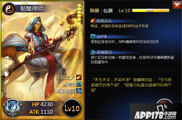 说到仙,想必大伙都有一直观的感觉:长生不老,生生不息。不论是神话故事中,还是不老传说中,仙人得道,炼就不死之身的例子比比皆是。《炼妖壶传奇》中,仙族的一大核心技能---“轮回”就能够完美体现这一特点。死亡后概率重新回到援军中,“轮回”的打不死特性大大增加了仙族的叠车轮能力,是不是很可怕?别着急,这才是“轮回”技能,“高级轮回”更加让你坐立不安。死亡后立刻召唤一名援军进场,自身概率重返援军中。“高级轮回”不光自己能复活,在自己死亡离开战场时还能直接将一名援军召唤进场,保证场上不减员,自身又能概率再次复活。小编就曾经被仙族队折磨的死去活来,痛苦至极。