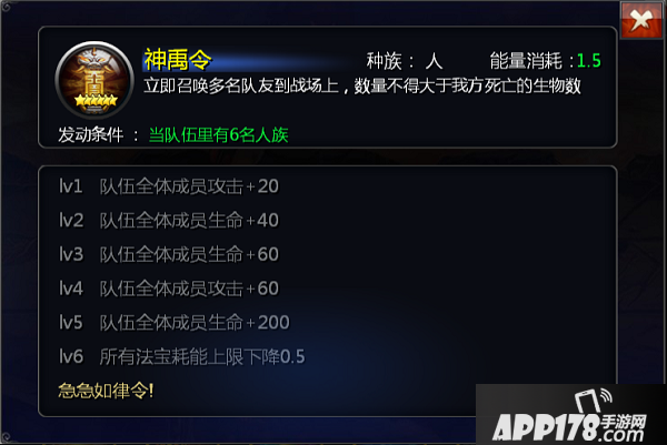 看了以上列举出的这几个技能,相信各位仙友都明白了吧,我人多,我就可以再次行动;我杀了你,我就可以再次行动。人族的特点在于场上人员越多,本方对于敌方所造成的伤害就会更加大,摆明的人多欺负人少,而且就是硬生生的欺负,怎么滴。说到这,小编就来强烈推荐一下人族的种族核心法宝“神禹令”,此法宝再次完美体现了人族的特点,试想一下,原本场上人数劣势,接近失败边缘,“神禹令”使用后,瞬间场上人满,别说打,吓都能把对方吓晕过去。人数突然间占了优势,如果再加上有振奋特性的卡牌,各种打各种拍,怎一个爽字了得!!!!!