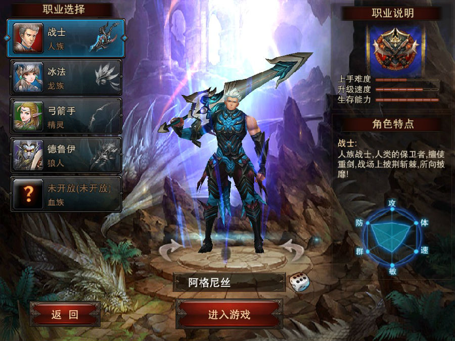 游戏中的职业选择范围很广,共设定有六大职业供玩家选择:龙族、人族、狼族、精灵族、血族和亡灵族。目前开放的是龙族法师、人族战士、狼族德鲁伊和精灵族弓箭手四大职业,他们虽然拥有不同的属性,但在变身后,都会强大到令人惊叹!