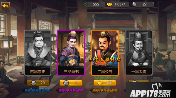 饰品的产出是通过平叛而来的,通过平叛积攒功勋可以通过功勋商店进行兑换。从白色到橙色都可以进行功勋兑换,分别为“四品宗正,三品尚书,二品少府,一品太尉”,而每一次兑换都是随机刷新。