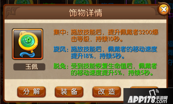 饰品品质越高则相对应的技能效果就越好,在升级为红色饰品后更可以单独升级相应技能,通过对饰品技能的了解则可以搭配出自己理想的武将状态,例如:关羽佩戴饰品技能为集中,激怒,会心则是相当变态的高爆高伤组合,更多的组合大家可以通过游戏不断探索,搭配每场战斗最佳阵容!