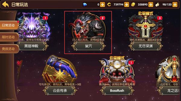 当玩家游戏中升到20级时,就可以参加一个新的日常活动——巢穴。巢穴进入条件要求玩家等级最低20级,后期要是愿意单刷的话,就要看你自己的本事了。巢穴每天有2次进入机会,当然在两次机会都用完后,玩家还可以再用龙币购买一次机会。所以小伙伴们一定要好好珍惜每天的这3次任务,不要平白浪费,那可是会损失很多经验和材料的呢。