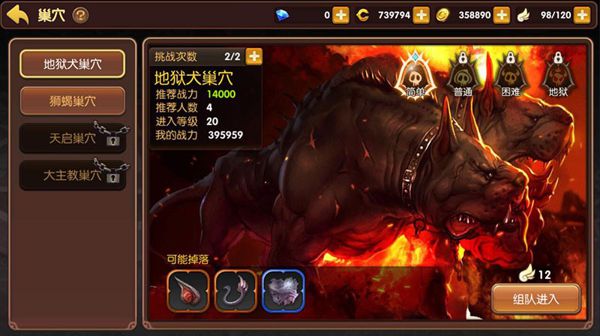 巢穴还有自己不同的难度存在,从低到高依次为简单,普通,困难和地狱四种模式,相应的每个模式的难度也是逐级增加的。只有通关了前一个难度模式,才有机会挑战下一个难度模式。同时,一些特殊的套装材料,也只能通过高难度巢穴副本才可以获得的,低难度副本是不会掉落的。每个巢穴获得的材料,则可以制作相对应的装备套装。地狱犬巢穴掉落的材料可以制作地狱犬套装。