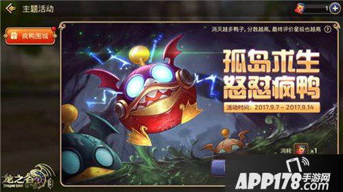 9月7日至9月14日,《龙之谷手游》将限时开放疯鸭围城副本。疯鸭围城副本为单人挑战副本,玩家进入需要消耗1张疯鸭围城门票。门票将会在活动期间内每天早上5点发放1张,若当天为周末,玩家可获得2张门票。疯鸭围城副本内的大部分区域都被水覆盖,玩家进入副本后将变身成学者,出生在水中央的小岛上,只拥有一个普通攻击技能。