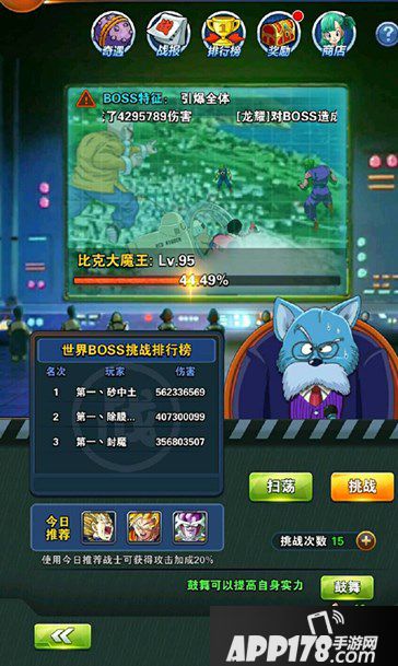 世界Boss每天上午9点开启战场,全服玩家都可以自己派遣战士上阵击杀Boss(每天有3名幸运战士哦),目前Boss有两种,分别是比克大魔王和贝吉塔。玩家累积伤害依次排名分发奖励,家族成员所有人积累伤害排名也是依次分发奖励。由此可见,要想输出最大化,就得从多种角度出发,合理安排时间,运用不同的战士和次数打出完美伤害。