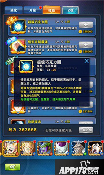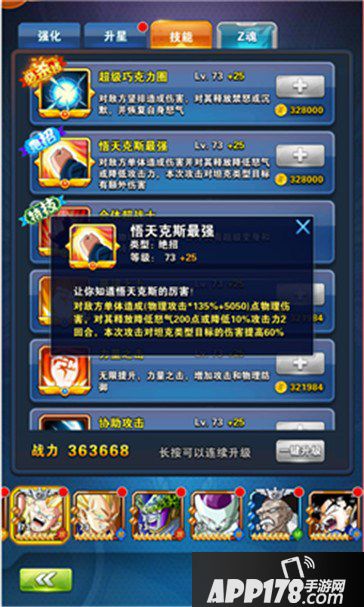 超级变身:当悟天克斯生命低于50%时,变身为超级赛亚人之3形态,恢复25%生命力,提高15%攻击力和15%防御力,并每回合恢复100点怒气直到战斗结束,变身后状态不可被驱散