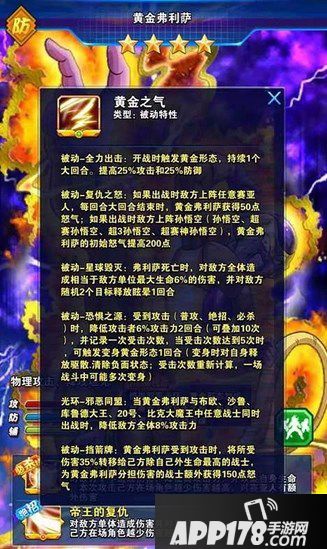 复仇之怒:如果出战时敌方上阵任意赛亚人,每回合大回合结束时,黄金弗利萨获得50点怒气;如果出战时敌方上阵孙悟空(超赛神孙悟空、孙悟空、超赛孙悟空、超3孙悟空),黄金弗利萨的初始怒气提高200点。