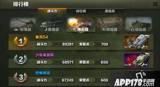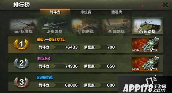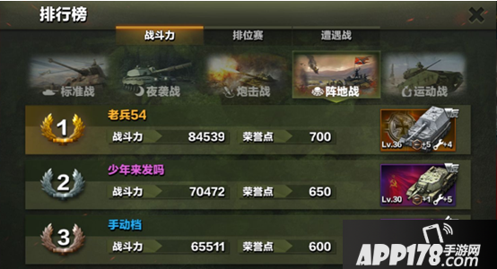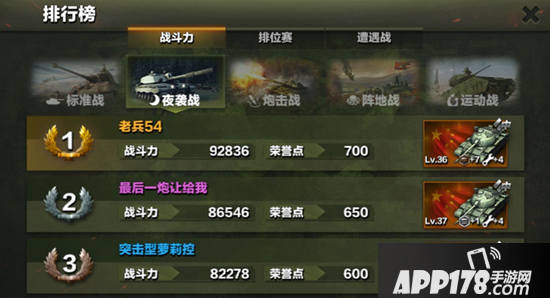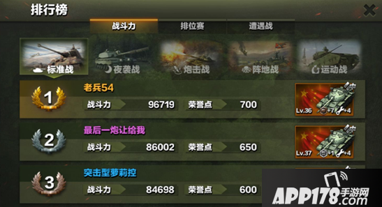 战斗力榜又分五个小榜,分别是标准战、夜袭战、炮击战、阵地战和运动战。