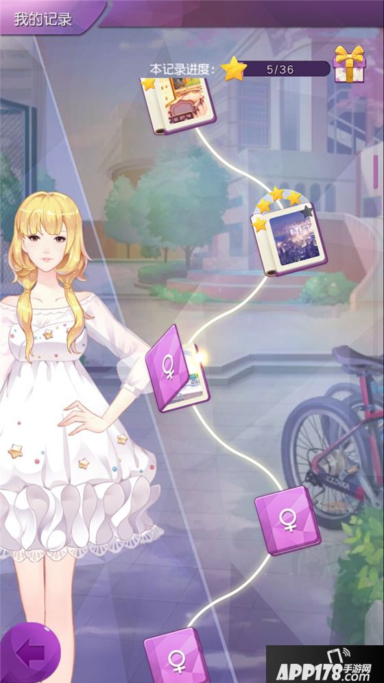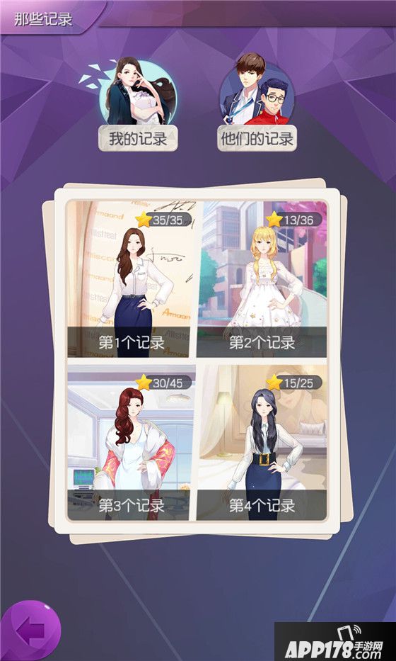 3. 每页分为四个记录,使用不同的人物着装图片,每个记录左/右上角显示该记录的星星收集进度(现有量/总量)