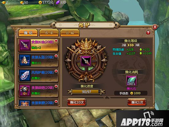 装备强化时,强化石固定可以增加50点装备经验,强化石可在辱楼幻境副本中获取。装备强化获得的加成属性,与装备固有的属性有关,所以前期优先强化武器、衣服、裤子等基础属性值较高的装备部位,装备最高可以强化到20级,在强化时有几率发生2倍、4倍、8倍的暴击!