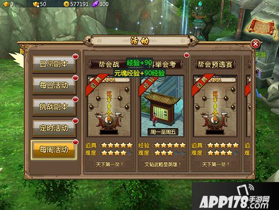 副本、装备强化、培养、挑战等等。每个任务完成有一定的金币、经验及帮贡奖励。
