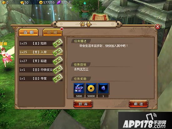 支线任务是进入主城洛阳之后接取的,打开可接任务列表便可以看到每天可接取的支线任务,完成支线任务有较为丰富的经验和金币奖励。