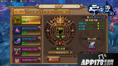 装备强化时,强化石固定可以增加50点装备经验,强化石可在辱楼幻境副本中获取。装备强化获得的加成属性,与装备固有的属性有关,所以前期优先强化武器、衣服、裤子等基础属性值较高的装备部位,装备最高可以强化到20级,在强化时有几率发生2倍、4倍、8倍的暴击!