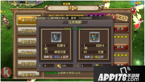 新区开放,升级肯定是小伙伴们最重要的事了,每日40次的循环任务是每日经验最大的产出,不能错过哦~对于小R玩家小编建议从活动奖励、任务奖励获得的绑定元宝,优先用于购买机缘令刷新普通任务,经验可以增幅不少哦,毕竟等级才是强大的基础啊,至于大R玩家,还用说吗?一键五星吧~~
