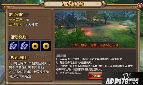 龙汉初劫在玩家角色30级时开启。在洛阳中间位置可以找到活动npc锦绣仙子夏涵,点击她接取龙汉初劫任务后,便可前往地图云圣谷了。