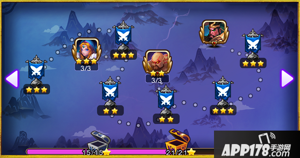 《魔霸三国》中的副本由剧情战役和精英BOSS组成,击败他们之后即可获得金币,宝物等副本奖励。同时,每场战斗都有三个难度评级,每完成一个难度可以获得一颗五角星。当五角星累计到一定数量可以通过开启宝箱获得额外奖励。
