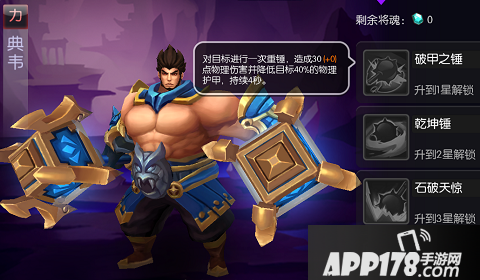典韦,初始一星的肉盾。一星技能是大量降低对手护甲,这让他成为打各类BOSS时,物理输出的必备选择。