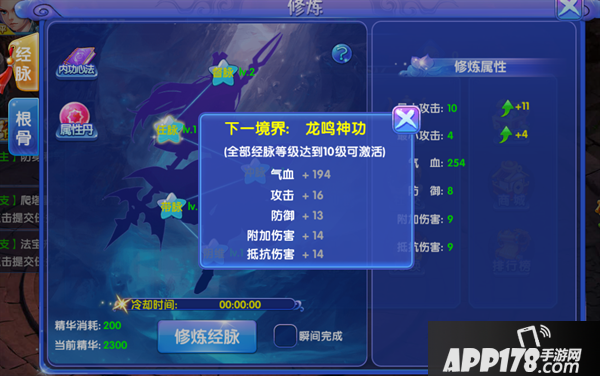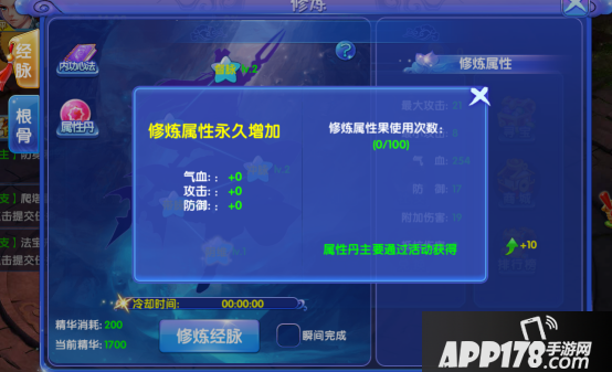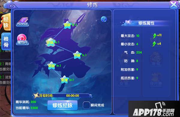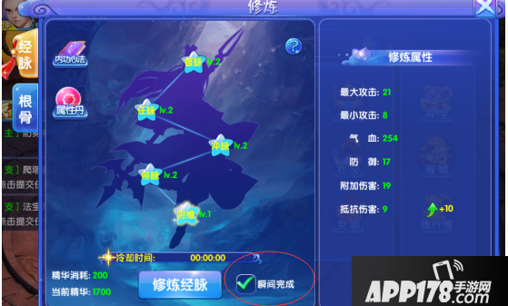 经脉系统通过爬塔副本获得精华,可以用精华来升级经脉,提升自身各项属性。经脉的修炼是循环的,依次提升血气,攻击,防御,附加伤害,抵抗伤害。