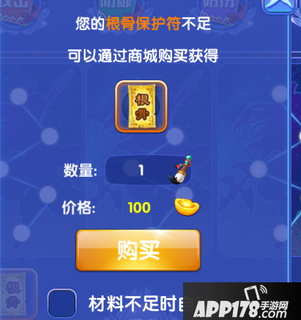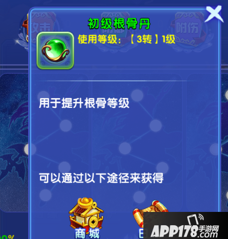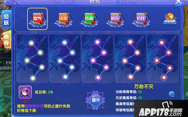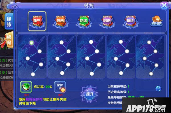 点开根骨,上面出现血气,攻击,防御,附伤,抗性的根骨丹,点击根骨丹后有个黄色边框,下面会显示对应根骨丹的属性以及提升根骨的消耗和成功率