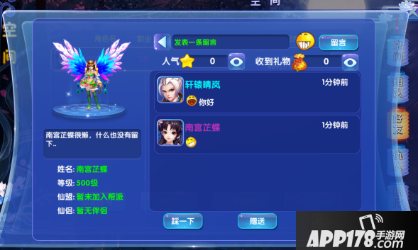 玩家在游戏中可以通过留言板来和朋友交流,玩家自己可以在仙侠空间发表自己的留言和心情,好友可以访问你的仙侠空间,并在你的仙侠空间下面回复你。玩家也可以访问好友的仙侠空间,踩好友空间会增加一定的活力值和人气。