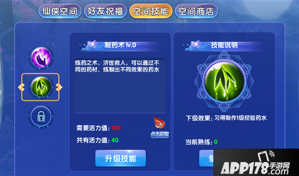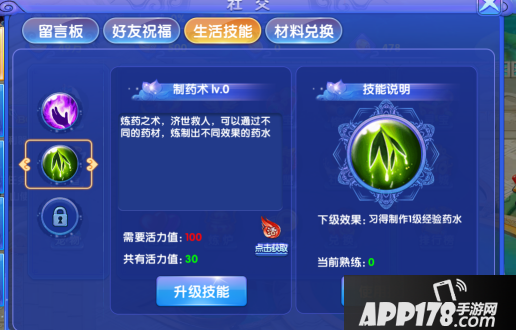 社交和活跃会获得一定的活力值,可以通过生活技能,学习附魔术和制药术。升级生活技能可以制造更高级的附魔属性和药水。每次使用技能会获得该技能的熟练度,熟练度越高,制作成功几率越大,制造高品质的几率也越大。生活技能所需的材料可以通过铜币兑换和打BOSS获得。