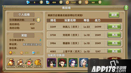 每次战斗结束后,如果历史排名上升到最高,会获得系统赠送的钻石奖励。排名越高的玩家每天系统结算时候,都会获得奖励越丰厚和大量功勋哦。功勋可在竞技场商店兑换稀有道具和英雄碎片。