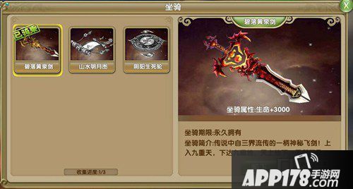 坐骑描述:传说中自三界流传的一柄神秘飞剑,上能入碧落九重天,下可达黄泉九幽地。得此一剑,天上地下,无所不及。