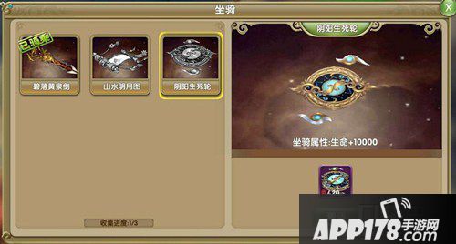 坐骑描述:传说中的洞天法宝,画卷内自行延化出一方世界。驾驭次法宝,可自由穿梭,纵横各界。