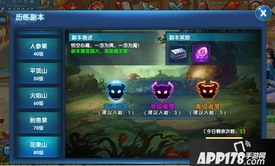 历练副本每10级开放一个副本,每个副本都有普通、中级、高级三个难度供玩家选择。