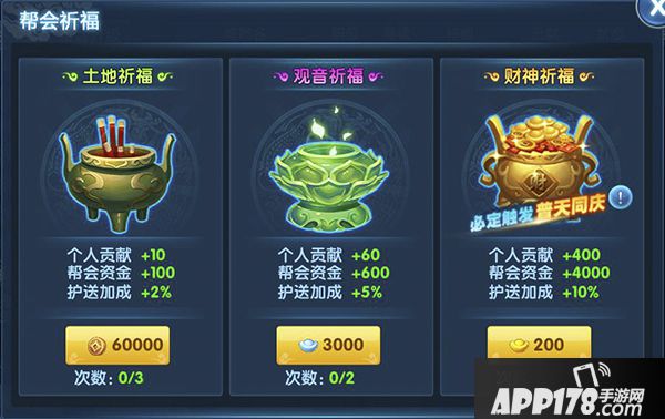 2.祈福后可获得相应的奖励:帮会贡献、帮会资金、护送加成。