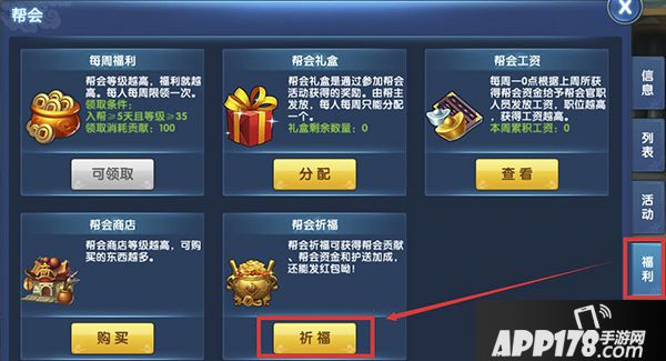 2.帮会祈福可通过“帮会福利”里面点击“帮会祈福”弹出祈福界面。