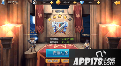 《天堂战记》竞技场中的段位设定分别为:青铜、白银、黄金、钻石、传说。每个段位都有5星等级,每场胜利可以获得1颗星,失败减1颗星,每个段位集齐5颗星时,可以解锁到更高层次的段位。玩家段位越高,则每次竞技带来的奖励越丰富。