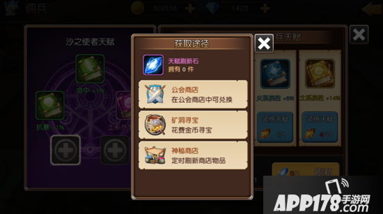 可以通过天赋刷新石来刷新你想学的佣兵天赋,天赋刷新石也有三个方式购买:1.公会商店通过捐献获得贡献值购买; 2.矿洞寻宝花费金币购买; 3.神秘商店通过钻石来购买。