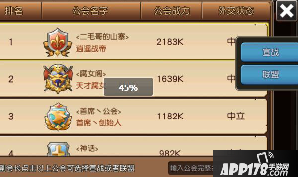 打开外交之后你将会看到游戏区服所有公会信息,正副会长点击公会可选择选宣战或联盟两种外交形式。