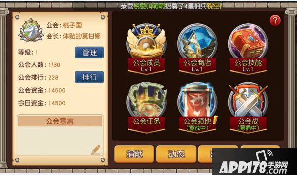游戏中打开公会图标即可看到4个功能可供选择捐献、动态、建设、外交。