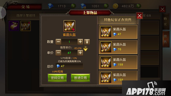 出售界面和购买界面则是完全不同了。在出售界面,您可以在左侧选择想要出售的道具,自定义价格和出售数量。诚然,如果您达到了一定VIP等级,还可以享受密码交易的特权。在界面右侧您还能看到其他玩家出售同类型道具的定价。推荐您在同类道具出售较多时,可以适当地降低自己的定价,这样更容易被其他玩家买走。