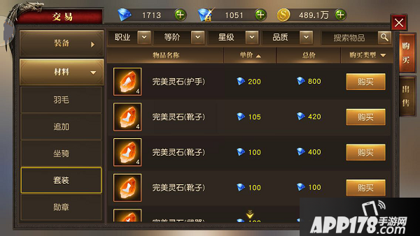 00001.套装石:套装石能打造套装,一整套套装能为玩家提供大量战力。而套装在游戏中比较稀缺,想要凑齐一整套套装石并不容易。因此,可以通过出售或倒卖套装石发一笔横财。如果您的财力足够的话,您还可以垄断某个热门职业的套装石市场,只要有其他玩家出售您就买下来,再以高价上架出售。