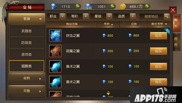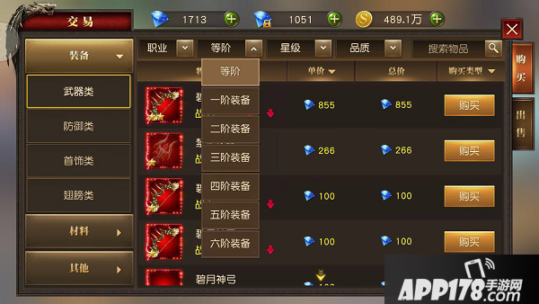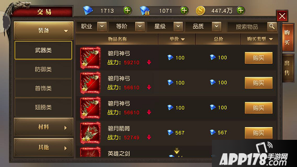 不仅道具进行了分类,游戏还对单个小类中增加了筛选功能。比如,在装备栏中,您可以根据职业、装备等阶、装备星级和品质进行筛选,这样方便您更快地找到自己想要的装备,而不用一页一页地去翻交易行了。同时,您也可以根据单价或总价进行筛选,一目了然地发现同类型道具中价格最低的那个。