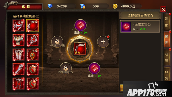 点击锻造进入镶嵌界面。玩家通过在装备槽孔上镶嵌对应宝石,提高人物属性和战斗力。每个装备部位都可以进行宝石镶嵌。宝石镶嵌跟随部位,更换相同部位装备时,宝石会一同继承。