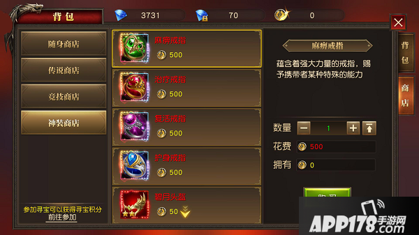 参加寻宝可以获得寻宝积分,在神装商店中消耗寻宝积分可以兑换相应的戒指。