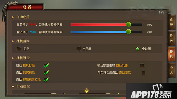 可以设置自动挂机打怪/自动购买药品/自动释放精灵技能/被玩家攻击时自动反击/角色死亡后自动原地复活;