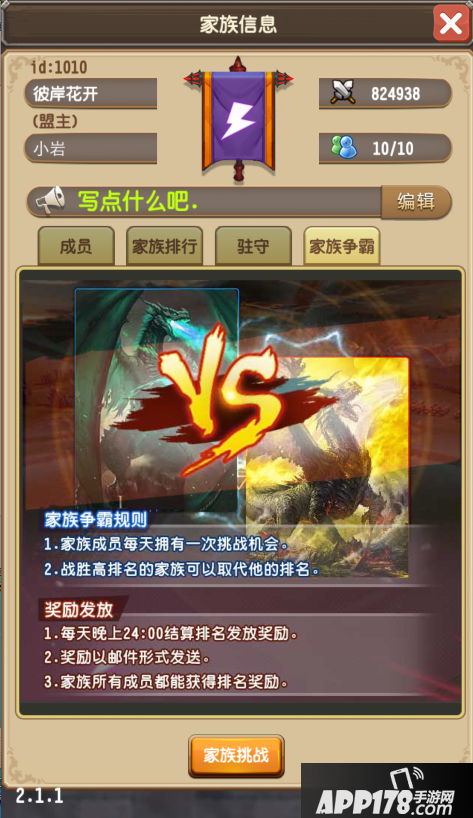 3) 家族挑战胜利之后,若对方排名高于自己家族则取代对方的家族排名