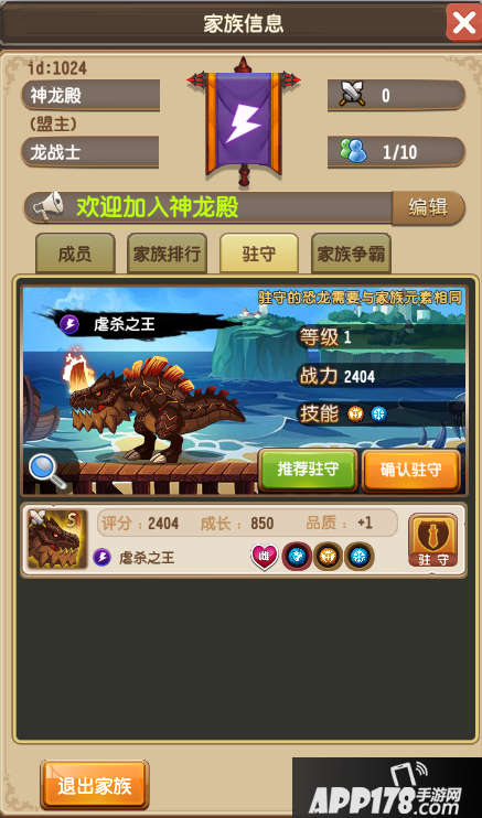 在家族界面中进入驻守界面,玩家可选择自己的恐龙驻守在家族当中。每个玩家只能驻守一只恐龙在家族中。驻守的恐龙的元素属性必须于家族的元素属性相同才能驻守,当家族更换元素属性时,驻守的恐龙全部撤销清空。