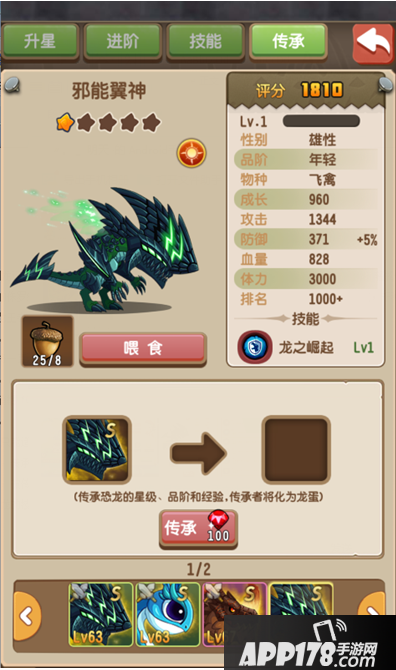 传承系统可以将一直恐龙的品阶、星级和经验传承给另一只恐龙,传承者将化为龙蛋!